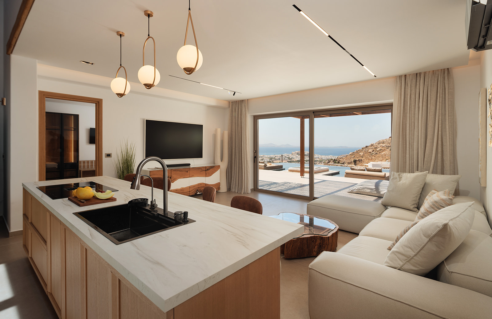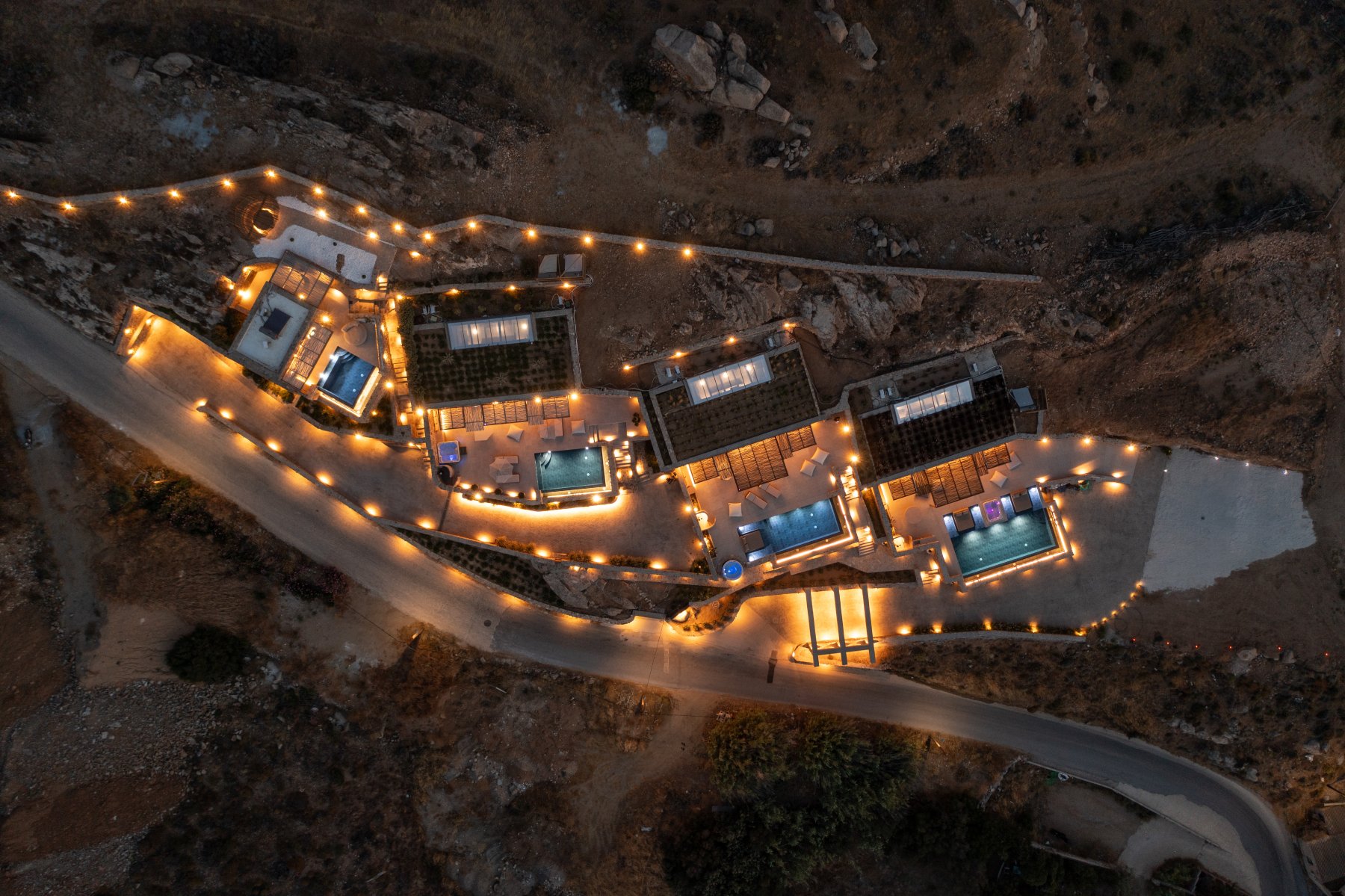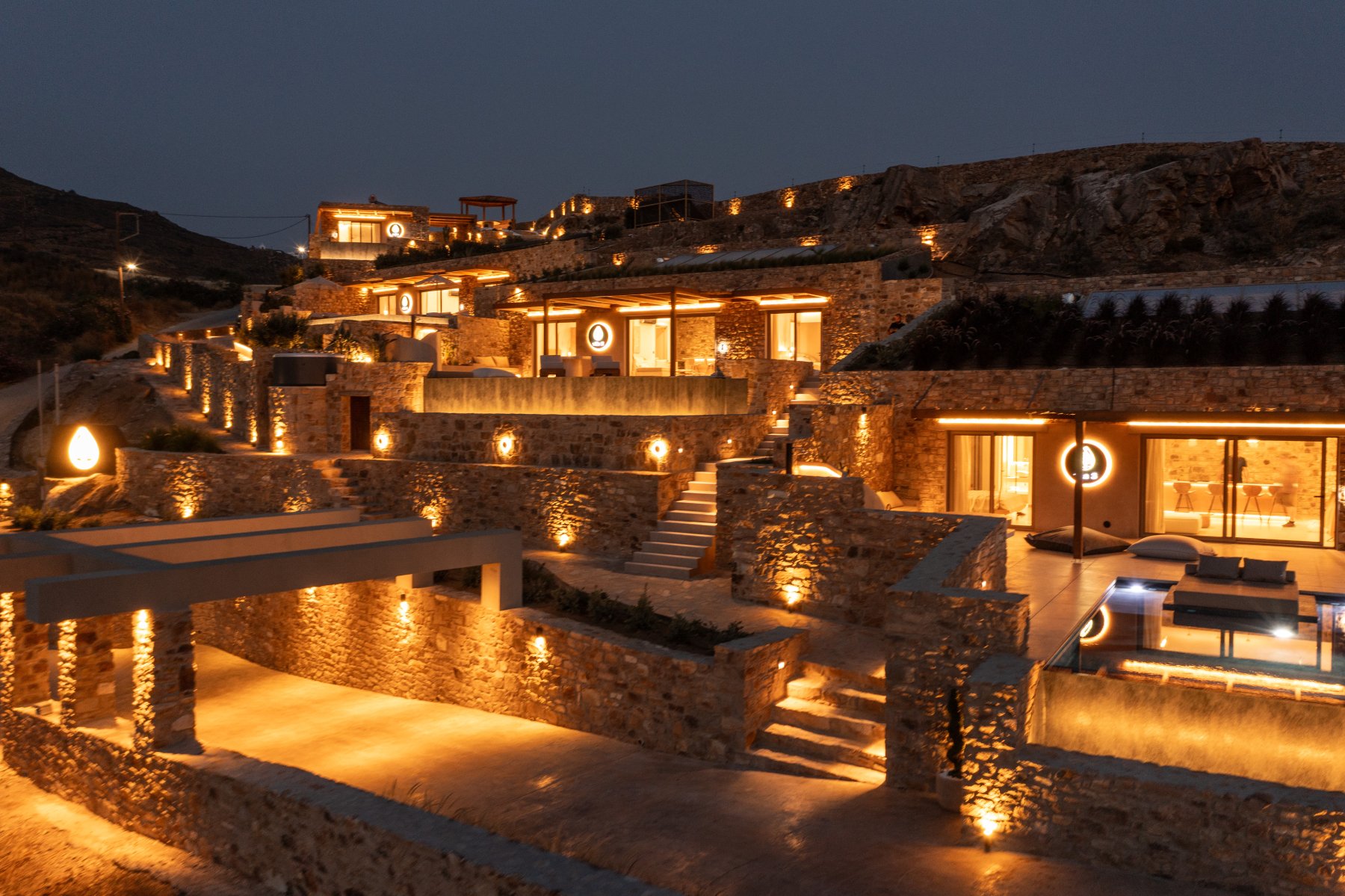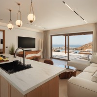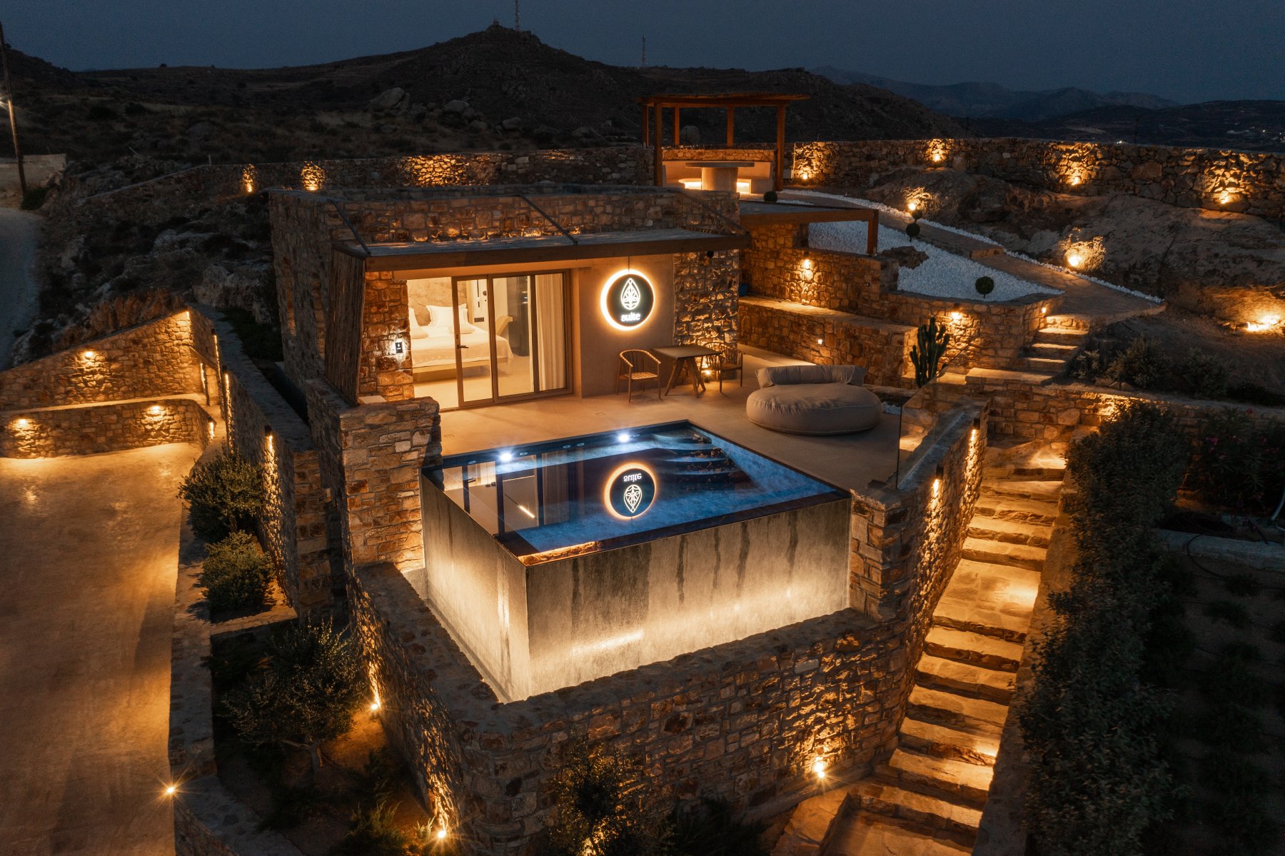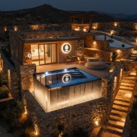 An iconic jewelry-inspired project on the island of Naxos, embodying unique aesthetics and luxury. Seamlessly integrated into the natural landscape without altering the mountain's form, it features Mediterranean landscaping and skillfully crafted natural stone architecture. The breathtaking views and unforgettable sunsets create a truly exceptional experience. The project includes 3 sub-constructed villas with 2 bedrooms, 2 large bathrooms, and a spacious living room with an island kitchen, all oriented to maximize the breathtaking view. Additionally, there is a master suite for a couple at the top of the project, featuring an opulent and luxurious finish throughout the entire development.