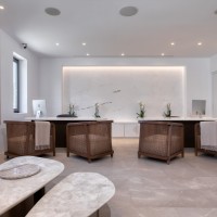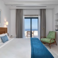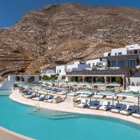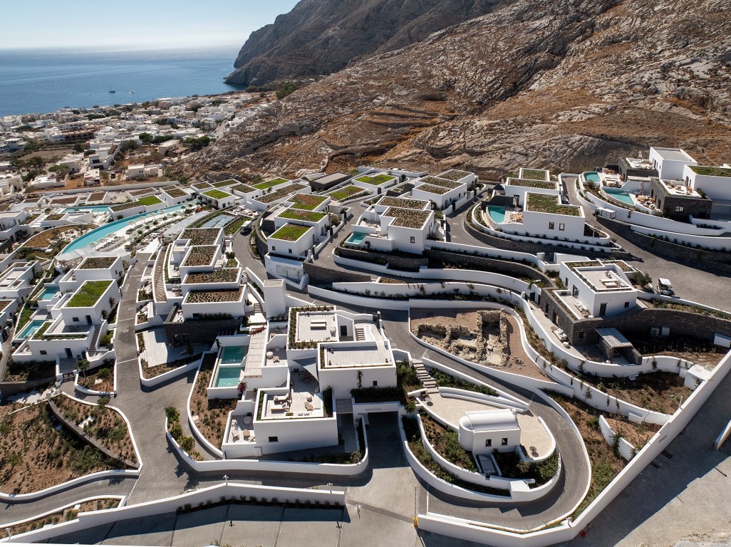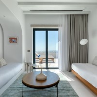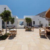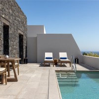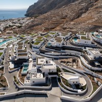 Sandblu Resort is located at the foothills of Ancient Thira, offering unobstructed sea views. The site is defined by the imposing mountain mass to the west, its unique landscape, and three landmarks: an archaeological site to the northwest, a central old aloni, and a cave house to the south adjacent to the rock. The building volumes, simple off-white prisms, are arranged amphitheatrically, following the natural contours. Common areas, strategically positioned, take advantage of the landmarks and the Aegean view. As the visitors move through the resort, they continuously have different views and surprises in both indoor and outdoor spaces.