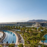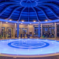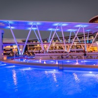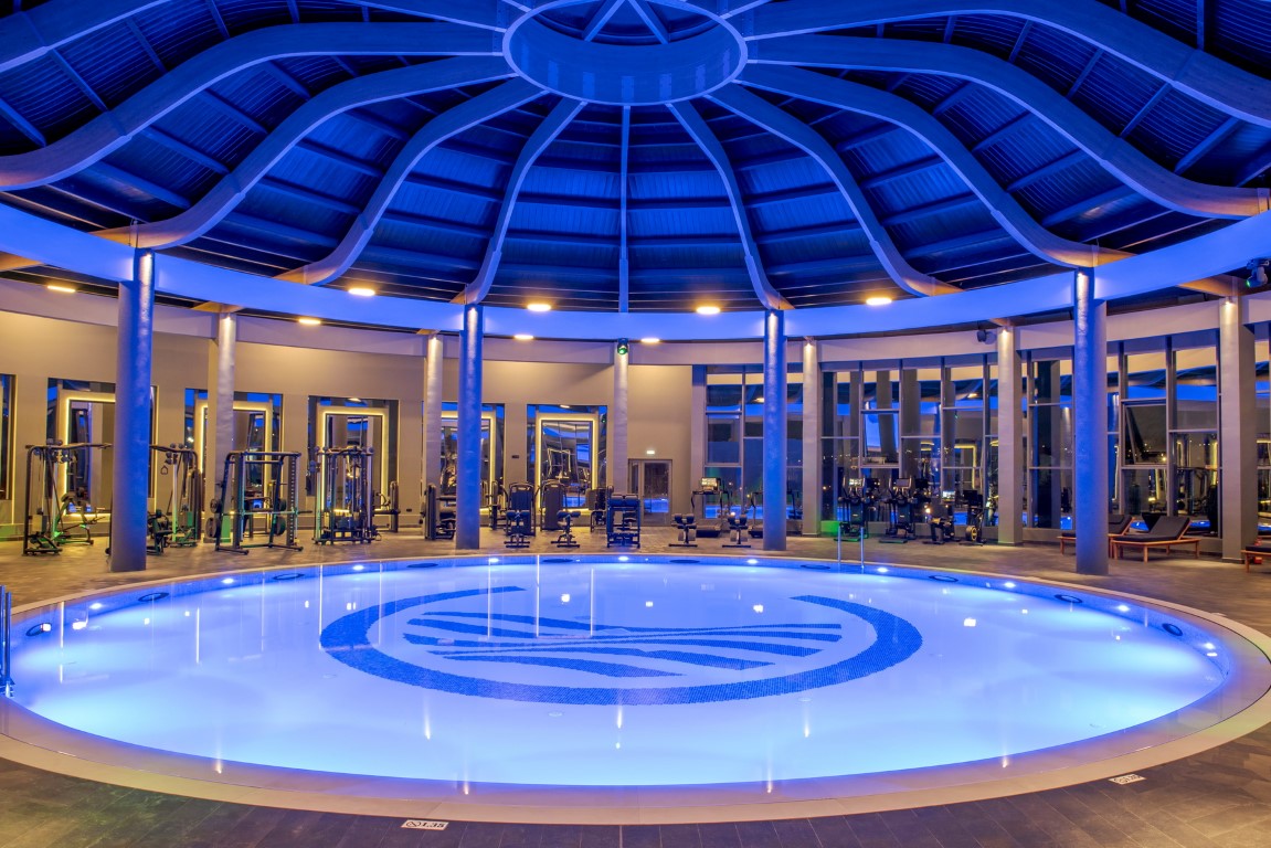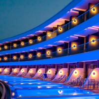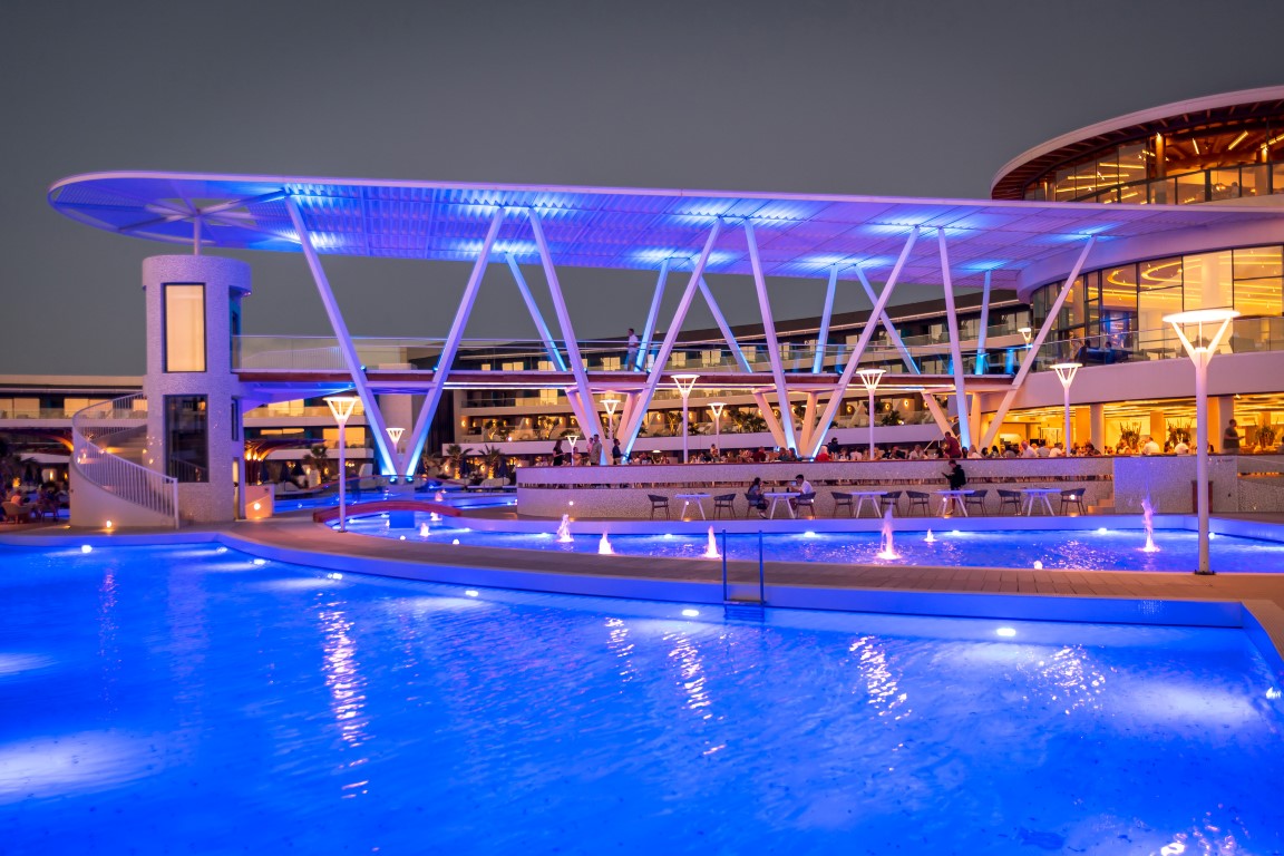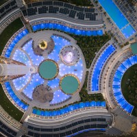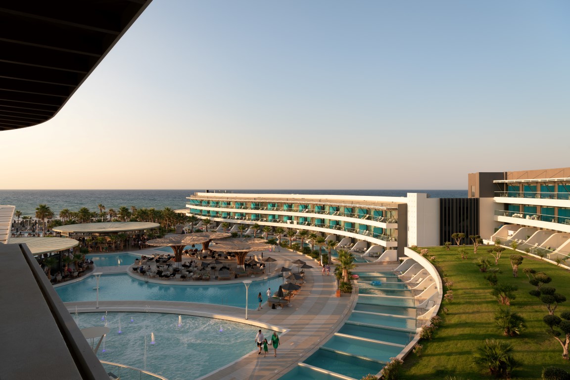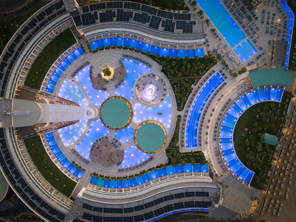 The complex includes various room types and underground suites. At the center, the water element dominates with five entertainment islands, which are connected to the reception via an iconic metal bridge. The construction is complemented by modern spa and gym facilities, while the rich planting with local flora enhances the bioclimatic function and aesthetics of the space.