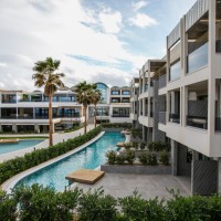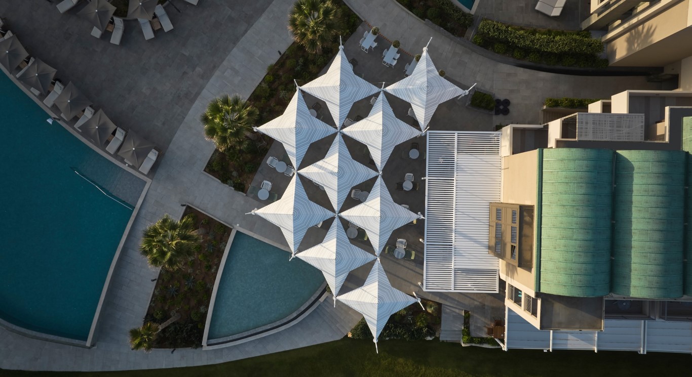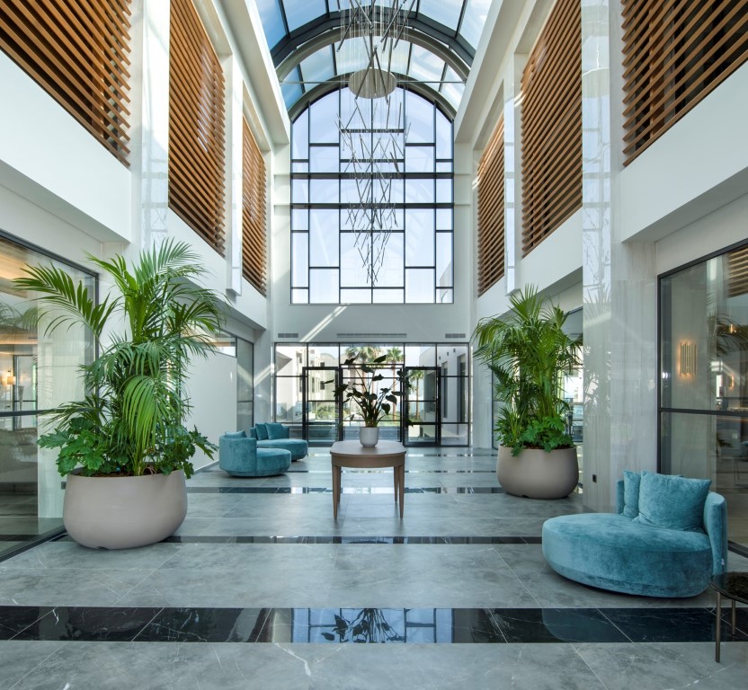 It spans a large semi-outdoor area and courtyard overlooking the pools and the beach. In the semi-outdoor area operates a wine bar. Below the reception area are the conference rooms, the spa and the gym. On the beach is the Mediterranean restaurant with the snack bar serving the pool. Above the restaurant is the 'fine dining' with a wonderful view .