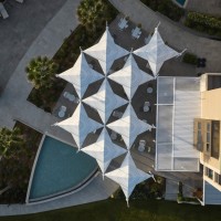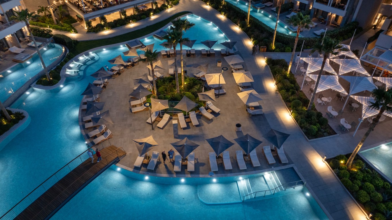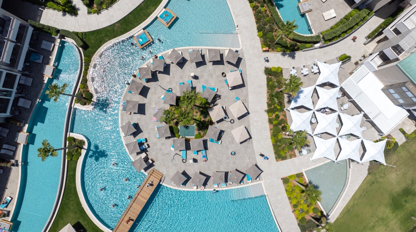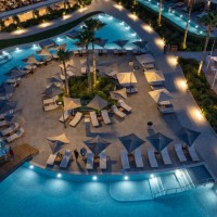 The swimming pools without visual limits towards the sea end in a waterfall. In the central one reception area we meet the entrance gallery (you arrive above a water feature with a deck). It has an illuminated ceiling of 120.00 sq.m. On the left we find the central lobby with the reception and the lobby bar, expand into a semi-outdoor area and a courtyard with a waterfall. It is on the right the main restaurant with buffets and a large "open" kitchen.