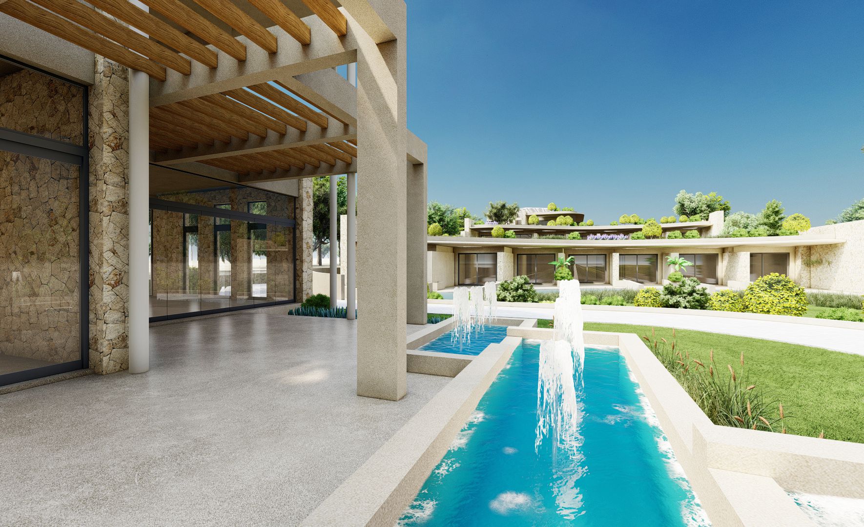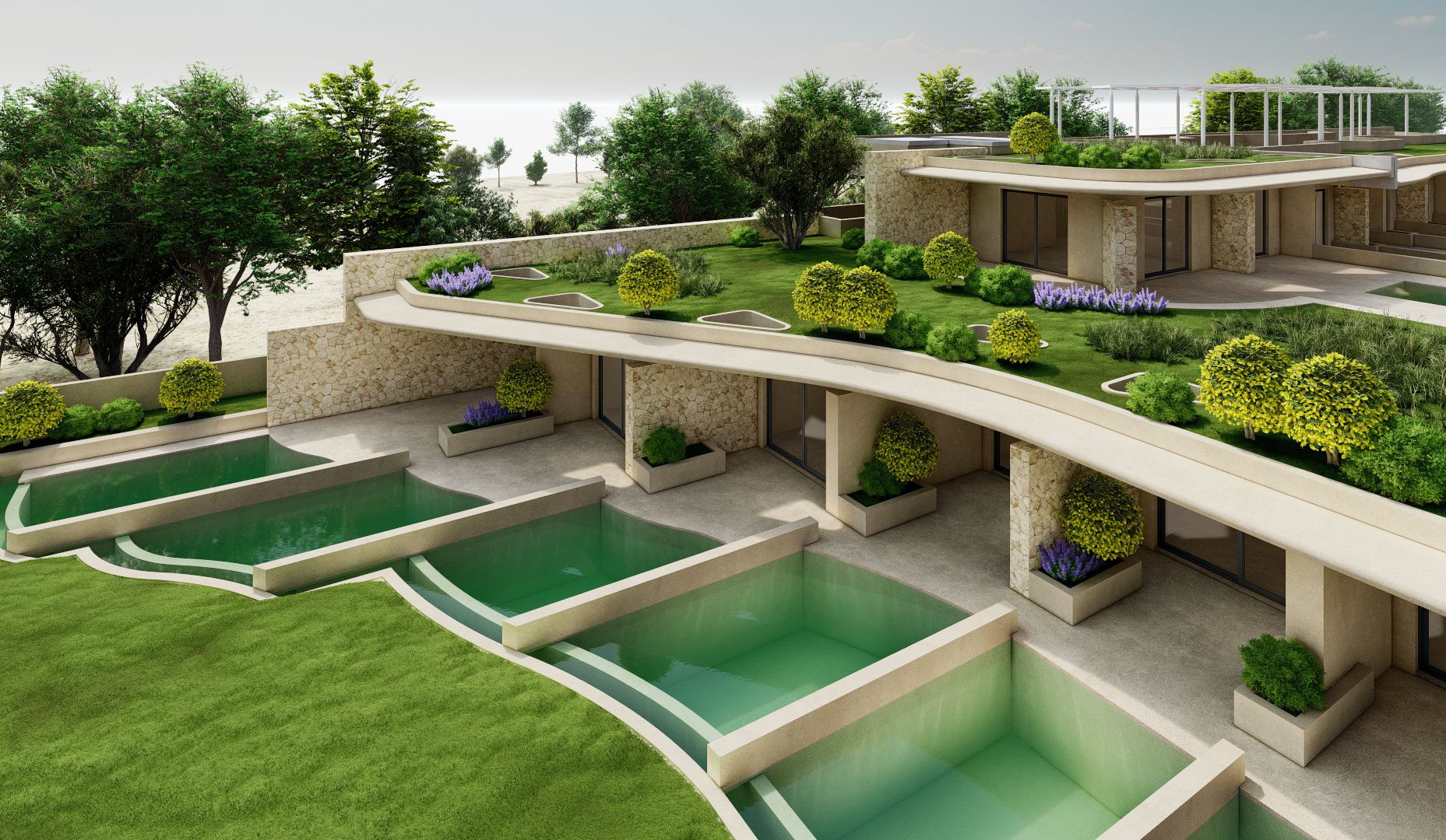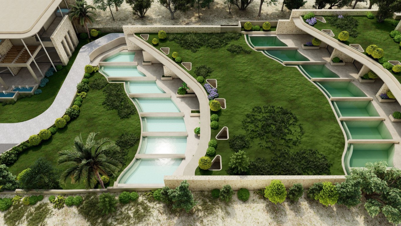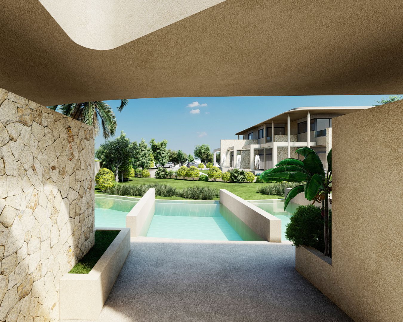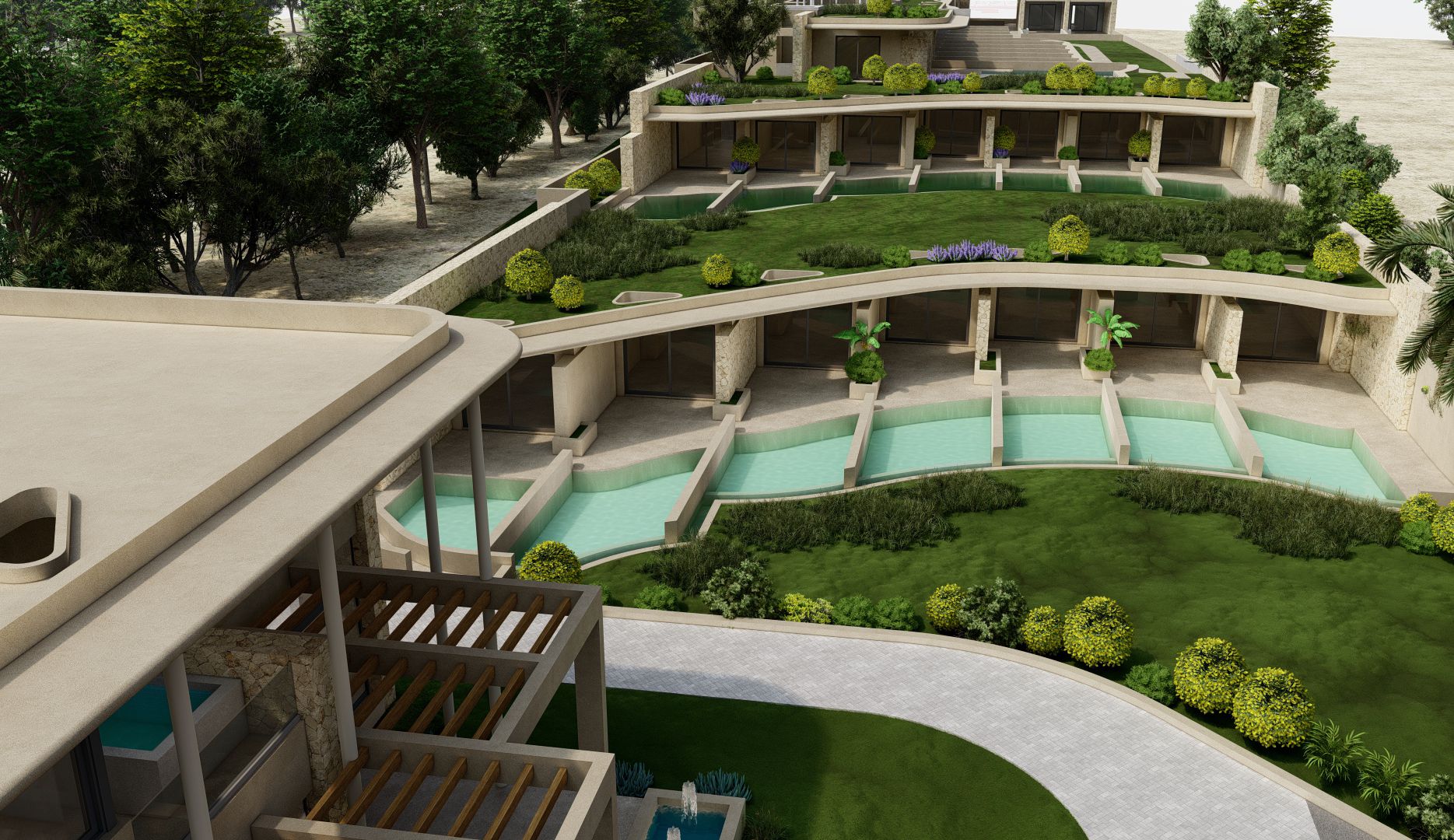 The design envisions a hotel of 44 rooms and suites, each with a private pool ranging from 15.00 to 19.00 sq.m. The building complex is highly articulated in terms of massing, comprising five structures, both single- and two-story, with some areas semi-subterranean and green roofs.