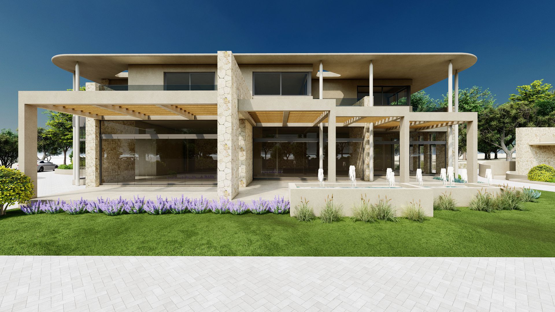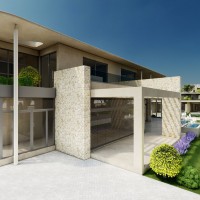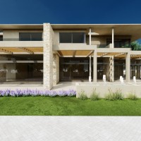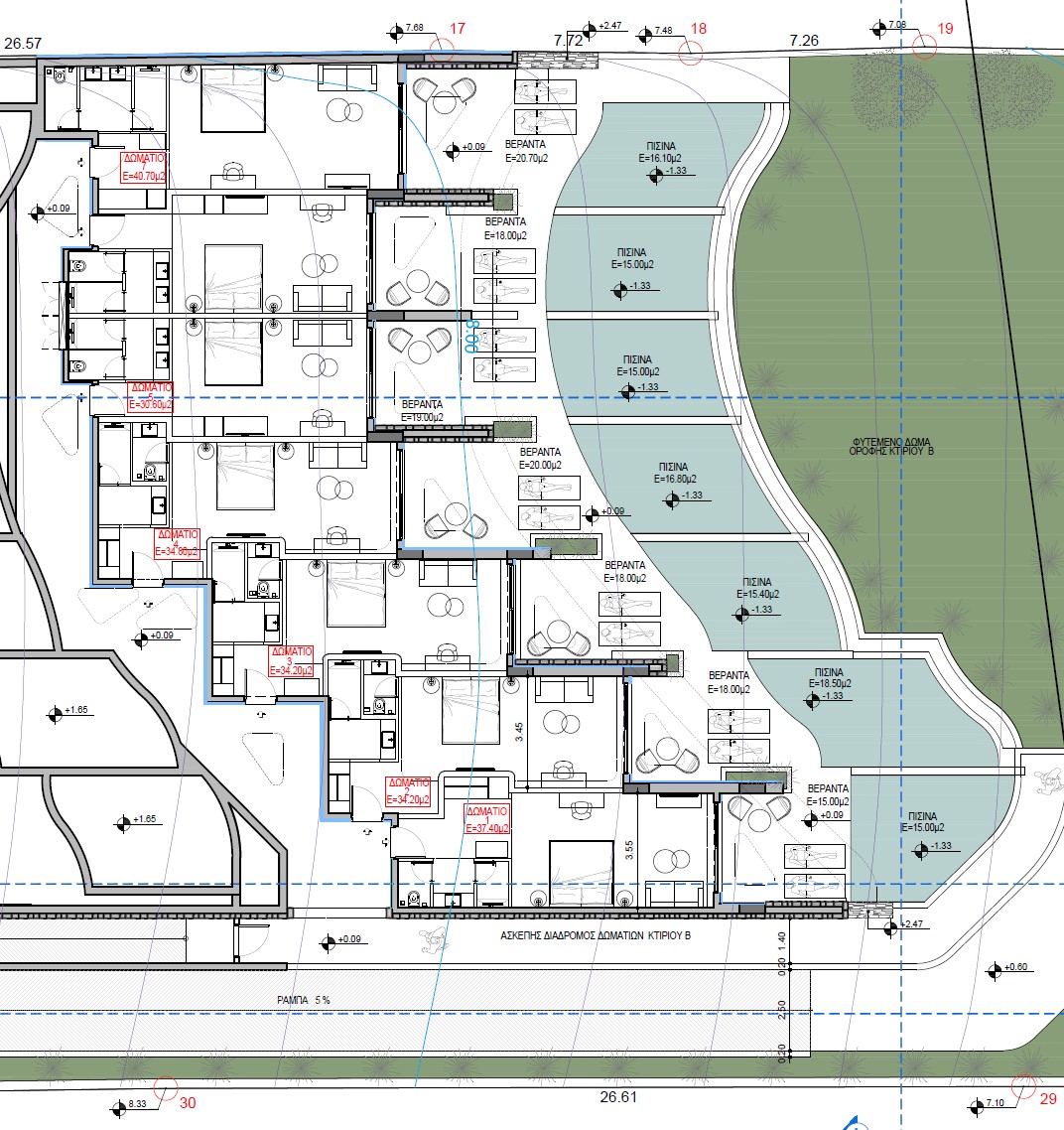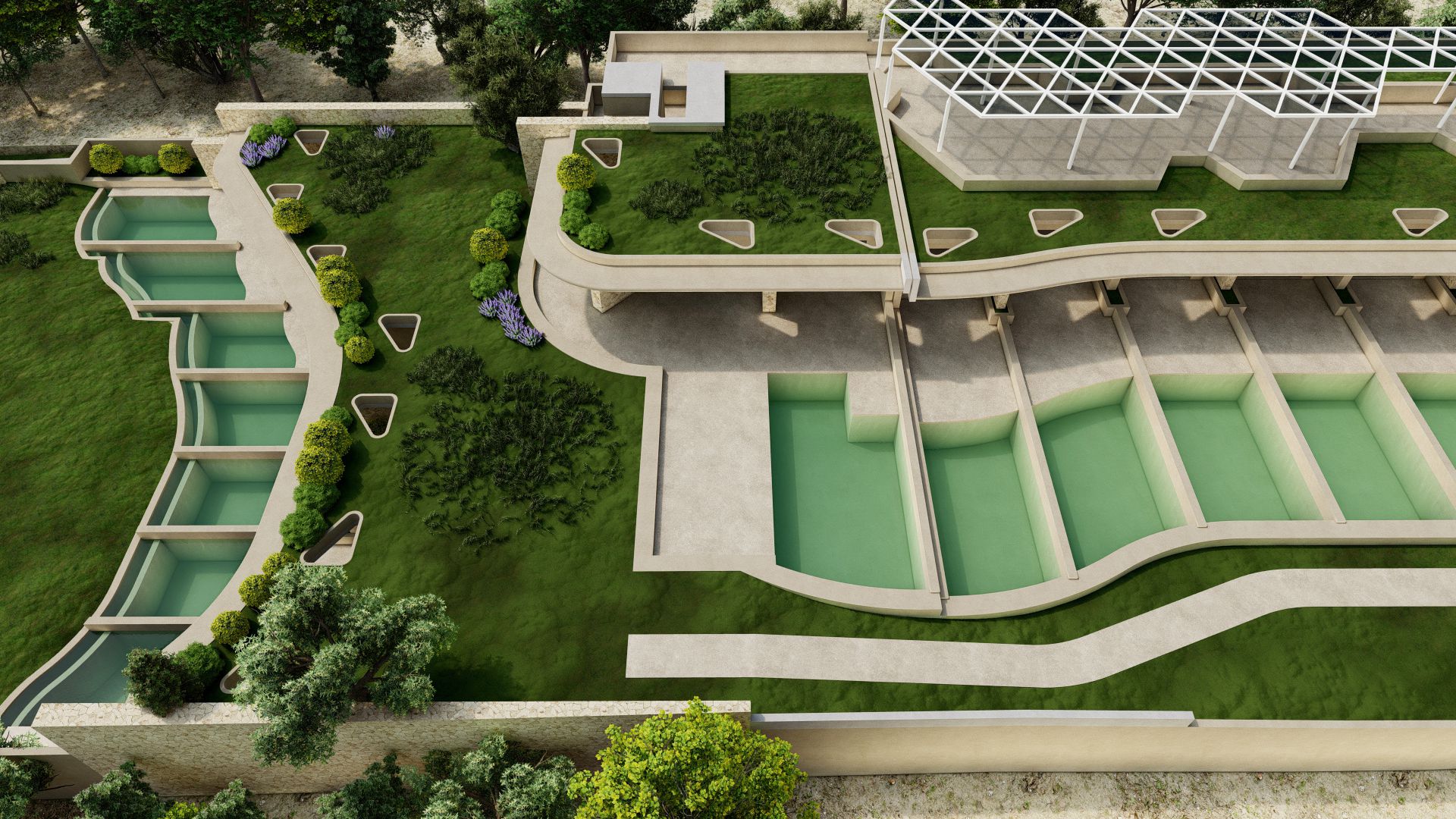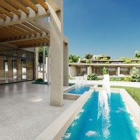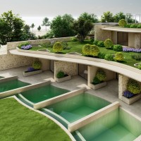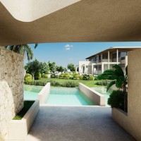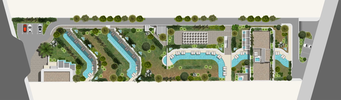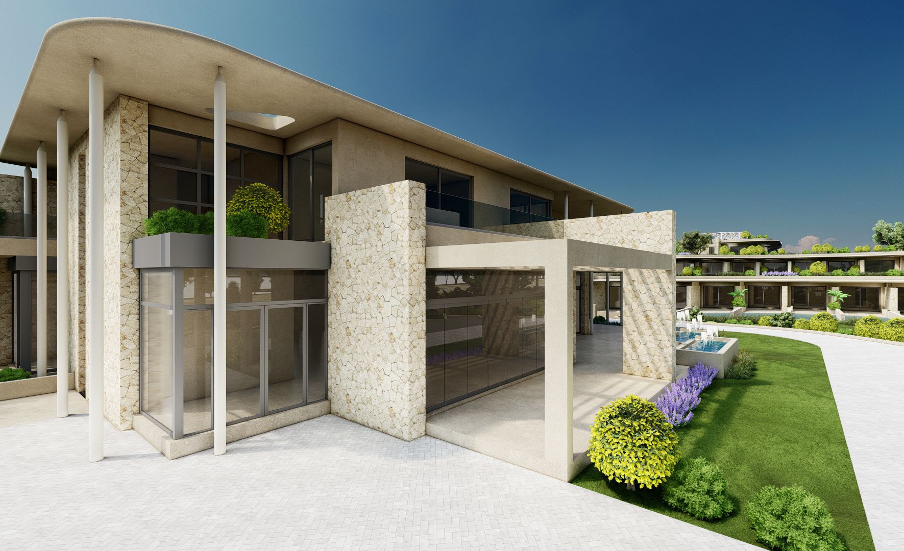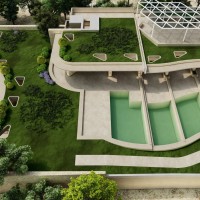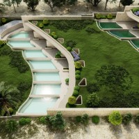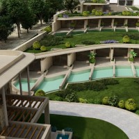 The design envisions a hotel of 44 rooms and suites, each with a private pool ranging from 15.00 to 19.00 sq.m. The building complex is highly articulated in terms of massing, comprising five structures, both single- and two-story, with some areas semi-subterranean and green roofs.