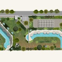 Curved triangular openings in the canopies allow natural light to illuminate the northern-facing verandas, while vegetation cascades from the planted rooftops. Above the third level, a lightweight structure made of perforated aluminum sheets, with a total area of 110.00 sq.m., forms a pergola intended for yoga sessions and wellness programs. This area offers magnificent views over the planted rooftops and the sea in the distance.