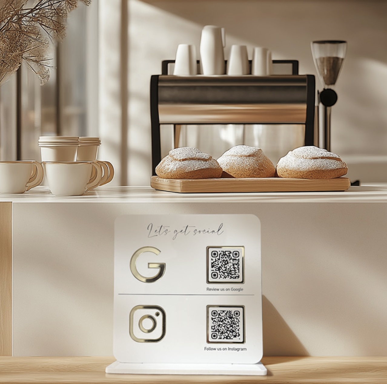 We design and produce metal prints and canvas artworks for rooms, lobbies, and common areas, as well as functional acrylic stands and QR signs for menus, room service, Wi-Fi, information, and Google reviews.