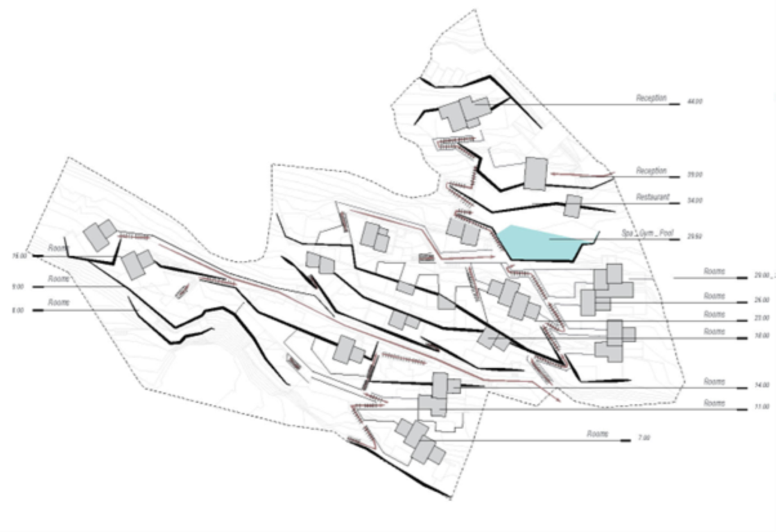 Το Onos Hotel προτείνει μια σύγχρονη αρχιτεκτονική ερμηνεία της σαντορινιάς τυπολογίας, εμπνευσμένη από την υπόσκαφη μνήμη και το ανάγλυφο του τόπου. Αναπτύσσεται σε οικόπεδο 12.351 τ.μ. με έντονη κλίση, συνθέτοντας 25 επιμέρους όγκους, πολλοί εκ των οποίων είναι υπόσκαφοι, σε μια κλιμακωτή γεωμετρία που ακολουθεί τον φυσικό ρυθμό του τοπίου.