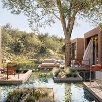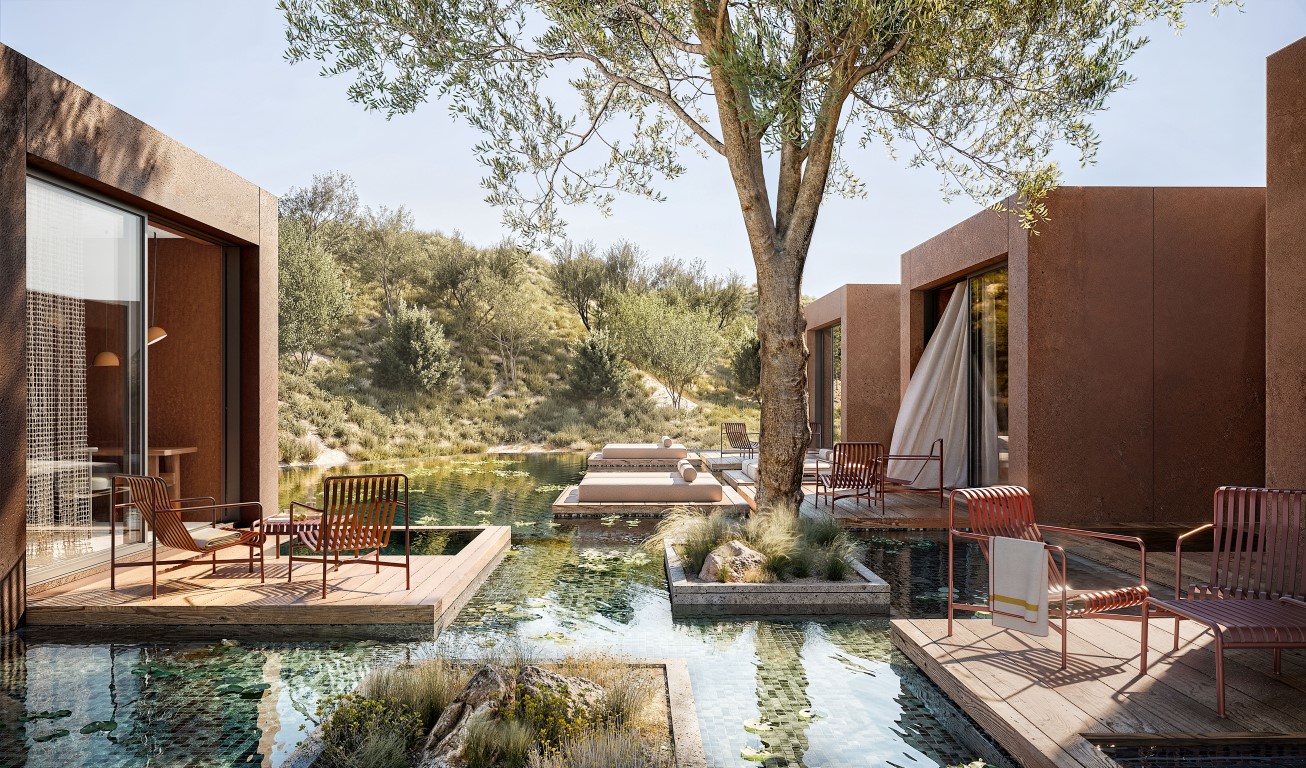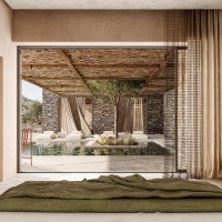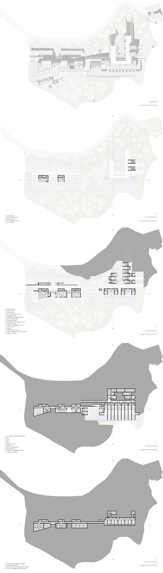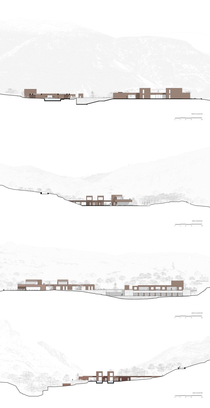 Πρωταρχική χειρονομία του σχεδιασμού του ξενοδοχείου 4 αστέρων Sifnos Mine επιφάνειας 2,600τ.μ. και δυναμικότητας 54 κλινών, είναι η χάραξη ενός επιμήκη άξονα Ανατολής–Δύσης, που ενισχύει τη θέα προς τις Καμάρες και το ηλιοβασίλεμα. Γραμμικά λιθόκτιστα τοιχία συγκροτούν τη βάση της σύνθεσης, εναρμονίζοντας την κατασκευή με το έντονο ανάγλυφο και αγκυρώνοντας τη σύνθεση στο έδαφος με ελάχιστο χωρικό αποτύπωμα. Οι λίθινες μάζες τέμνονται κάθετα από οριζόντιους άξονες κίνησης, που συνδέουν δημόσιες και ιδιωτικές λειτουργίες. Η λίθινη βάση (podium) σταδιακά αποδομείται, καθώς οι κάθετοι άξονες από πεπιεσμένο ευκάλυπτο λειτουργούν ως «ρήγματα» προς το φαράγγι, διαμορφώνοντας την εσωτερική όαση και το σύνολο των 25 δωμάτιων και αποδίδοντας τη μετάβαση από το στιβαρό στο ελαφρύ, σε διάλογο με το τοπίο και τα ορυχεία.